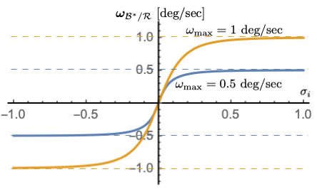 Here as \(\sigma_{i} \rightarrow \infty\) then the function \(f\) smoothly converges to the maximum speed rate \(\pm \omega_{\text{max}}\). For small \(|\mathbf\sigma_{\mathcal{B}/\mathcal{R}}|\), this function linearizes to