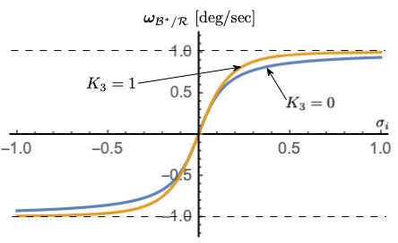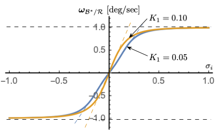 If the MRP shadow set parameters are used to avoid the MRP singularity at 360 deg, then \(|\mathbf\sigma_{\mathcal{B}/\mathcal{R}}|\) is upper limited by 1. To control how rapidly the rate commands approach the \(\omega_{\text{max}}\) limit, Eq. (15) is modified to include a cubic term:
